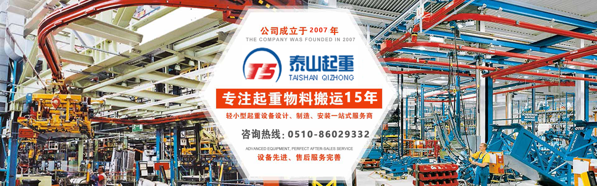 江陰市泰山起重設備有限公司座落在富庶的現代化港口城市——江陰市南閘鎮工業園區,緊靠錫澄高速,錫澄路,北依江陰港區,貫通滬寧高速的世界第四、中國第一的江陰長江大橋,穿越而過,飛架南北,高速至上海虹橋機場僅2小時,南又緊靠正在建設中的無錫國際機場,交通便捷,環境優美?! ”竟緦I為壁行式懸臂起重機、KBK軌道,鋼絲繩電動葫蘆、環鏈葫蘆、KBK組件,梁式起重機、電動旋臂起重機等配套起重機械配件,主要產品有:KBK軌道,梁吊掛裝置、環鏈葫蘆,KBK組件,手動式小車、行車走輪、電纜滑車等起重機配件,同時可提供起重設備的安裝、維修、為客戶提供全方位的技術咨詢等各項服務。  公司的管理將“以人為本”作為宗···...